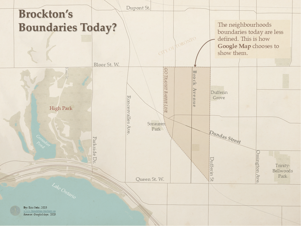 As we’ve seen, Brockton’s boundaries have continuously shifted over time. Different historical topics will focus on different time periods, and the geographic focus will depend on how the village or neighbourhoor was defined. For this project, I’ll generally default with Google’s present-day definition, but earlier maps—like Tremaine’s from 1860—reveal that Brockton had a much larger footprint. Some topics may even require zooming to explore the broader history of York County and western Toronto.