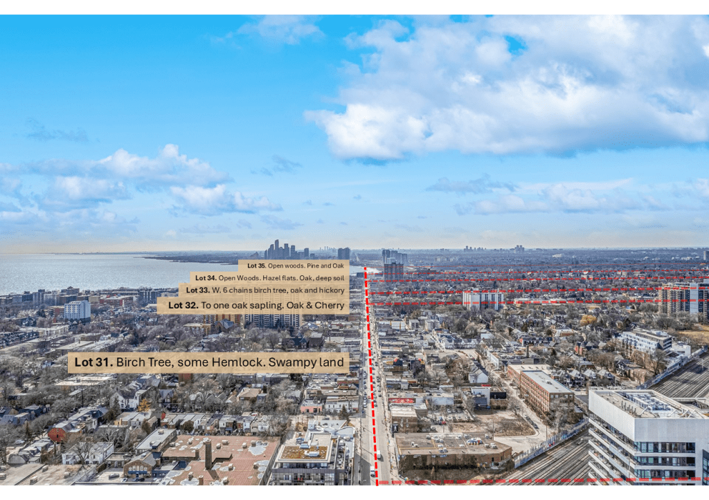 His team walked one final stretch: 4.1 kilometres along what would become Queen Street, from around Portland Street to Parkside Drive. He recorded vegetation and terrain along the way, reproduced in the map above. A lost “high point” where he encountered the Garrison Creek Ravine, swampy lands in West Queen West, the ancient oak savannah in Parkdale. It was the final line in a summer of transformation.